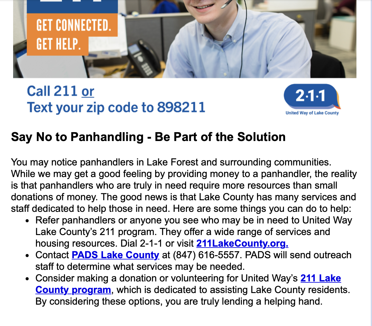 Furthermore, Lake County taxpayers and philanthropic donors generously fund PADS Lake County, "is a community-based organization that provides trauma-informed support, resources, and shelter to individuals and families experiencing homelessness and a housing crisis." Individuals, claiming as their own residence public property in Lake Forest and Lake Bluff have options for temporary housing and support, but are choosing to live on public land in less sanitary conditions and without monitoring by social workers who can help them move to more stable housing solutions.